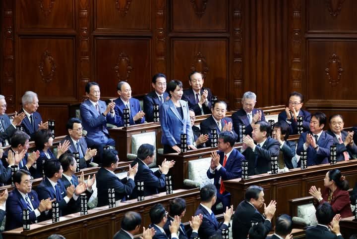 epaselect epa12468985 Sanae Takaichi (C) acknowledges her fellow lawmakers after being elected as the new Prime Minister during the general assembly of an extraordinary parliamentary session in Tokyo, Japan, 21 October 2025. Japan’s ruling Liberal Democratic Party President Sanae Takaichi became Japan’s first female prime minister. EPA/FRANCK ROBICHON