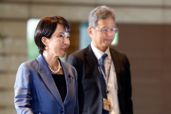 epa12469105 Sanae Takaichi (R) smiles as she arrives at the Prime Minister’s official residence after being elected as the new Prime Minister in Tokyo, Japan, 21 October 2025. Japan’s ruling Liberal Democratic Party President Sanae Takaichi became Japan’s first female prime minister. EPA/FRANCK ROBICHON