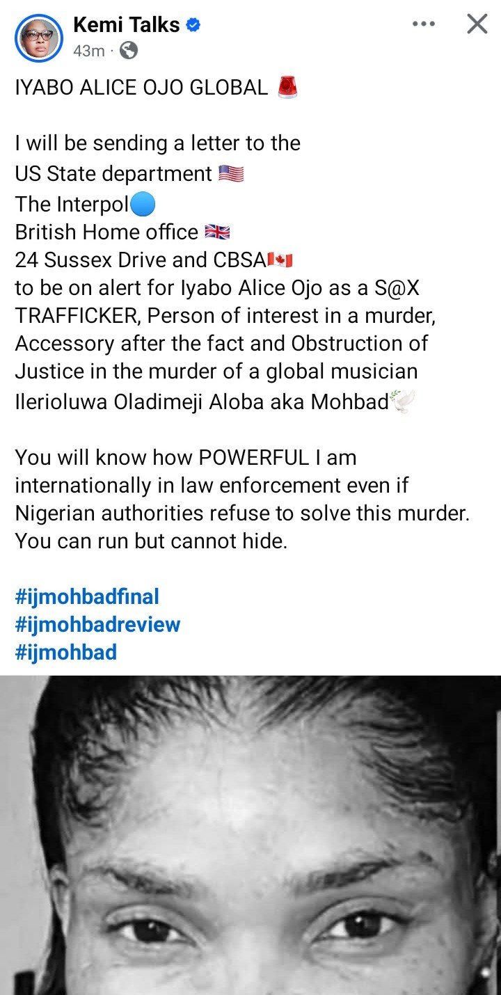 In a post shared on her verified Facebook page on Sunday evening, August 17, 2025, Dr. Kemi said she would be sending letters to the U.S. State Department, Interpol, the British Home Office, and Canadian authorities at 24 Sussex Drive and CBSA, calling for Ojo to be placed on international watchlists.