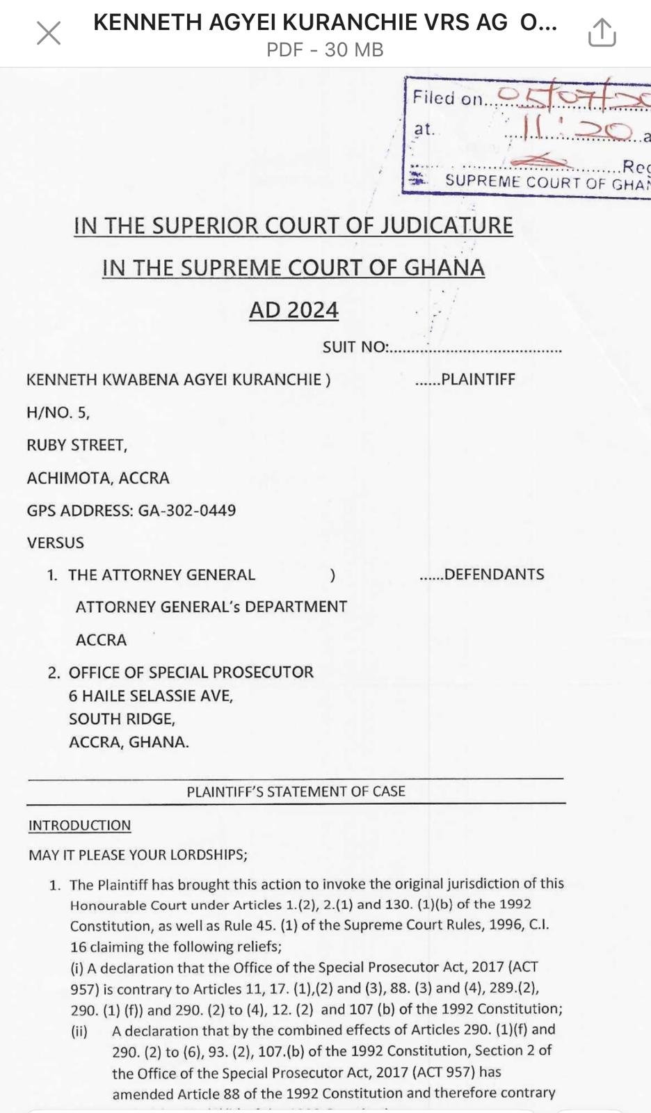 Mr Kuranchie wants the Supreme Court to annul the law establishing the OSP.