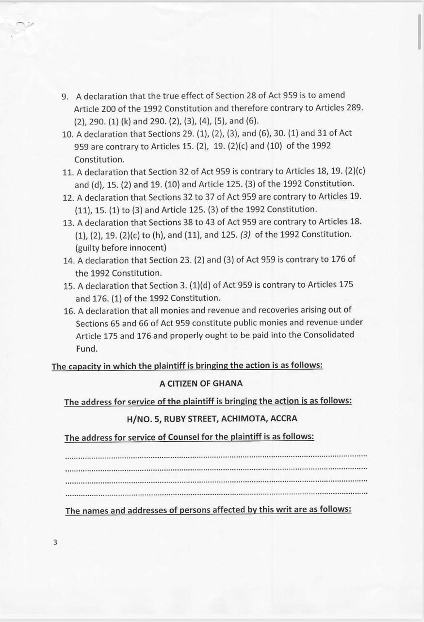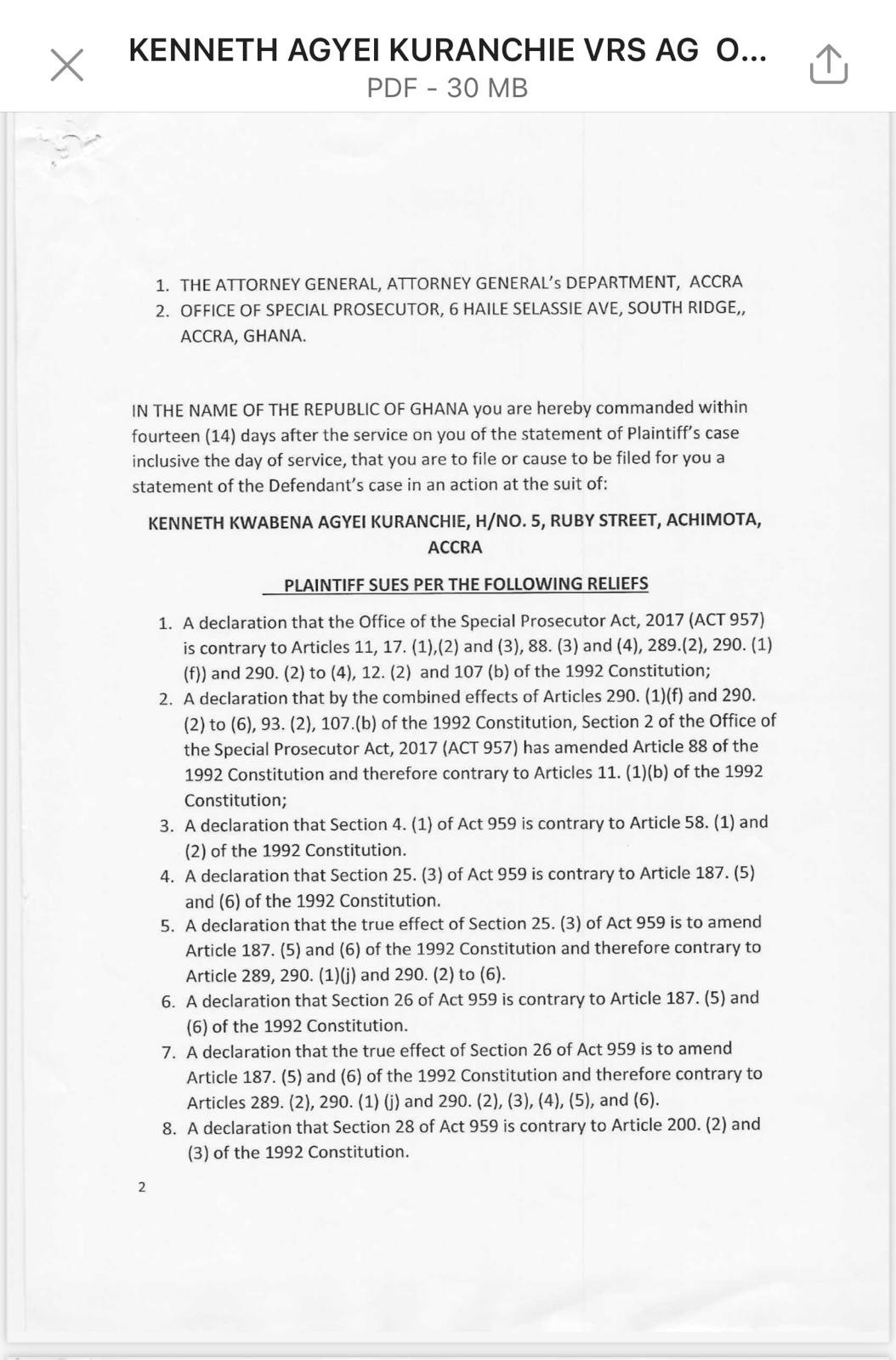 Among other things, Mr Kuranchie in his writ to the Supreme Court sighted by Citi News on Saturday, July 6 invoked the Supreme Court to declare the Special Prosecutor Act, 2017 (ACT 957) as contrary to “Articles 11, 17. (1)(2) and (3), 88. (3) and (4), 289.(2) 290. (1) (f)) and 290. (2) to (4), 12. (2) and 107 (b) of the 1992 Constitution.”