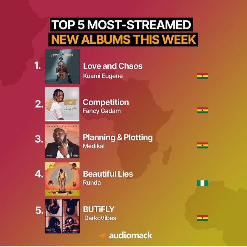 Second on the list of most-streamed albums on Audiomack this week is the album of the singer of Northern Ghana origin, Fancy Gadam whose ‘Competition’ musical project is also making waves. Singer, Medikal’s ‘Planning and Plotting’ album is third on the prestigious list.