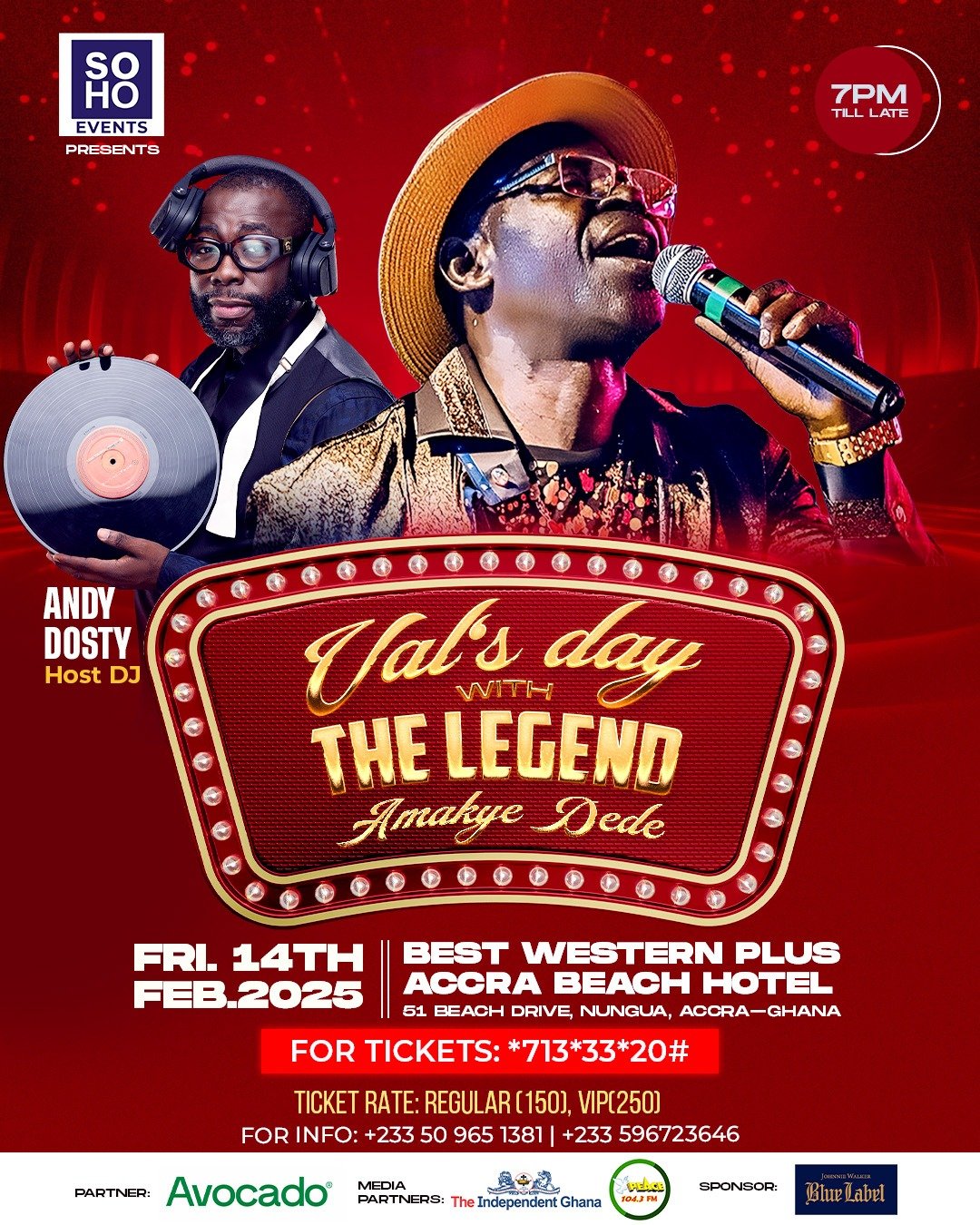 On February 14th, Soho Accra presents “*Simply Irresistible*”, a night of music, dancing, and romance with the SoHo band. Meanwhile, the Best Western Plus Accra Beach Hotel will host “Val’s Day with the Legend Amakye Dede”, a special concert featuring the Ghanaian music icon.