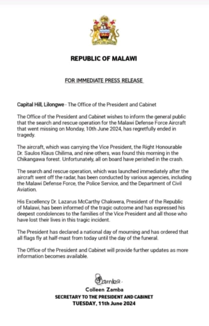 President Chakwera had announced the death of his Vice President and the nine others on Tuesday morning.