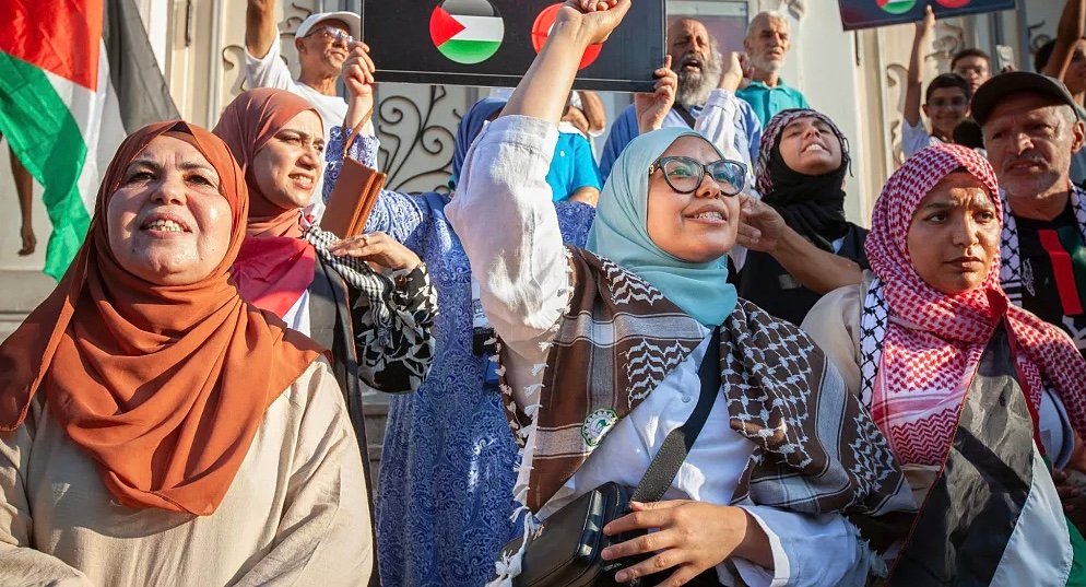 The crowd paused to sing the Tunisian national anthem, a moment of national unity blending with the shared Arab and Islamic cause.