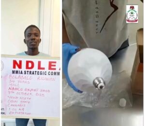 One of the suspects, identified as Boladale Riliwan, a cargo agent, was arrested on October 7 at the export shed of the Murtala Muhammed International Airport (MMIA), Lagos, after officers discovered 15 parcels of skunk — a potent strain of cannabis — hidden inside 10 large rechargeable electric bulbs packaged for shipment to the DRC.