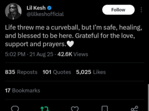 While details of the incident remain limited, Lil Kesh’s message has comforted fans, who have flooded his social media with words of encouragement and well wishes.