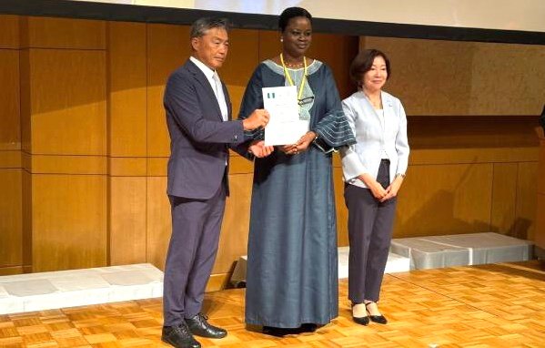 Nigeria’s Charge d’Affaires, Mrs. Florence Adeseke, who doubles as the Acting Ambassador to Japan, received the certificate, presented by Yoshikuni Watanabe, the Mayor of Kisarazu, from the Japanese government, naming Kisarazu the hometown of Nigerians.