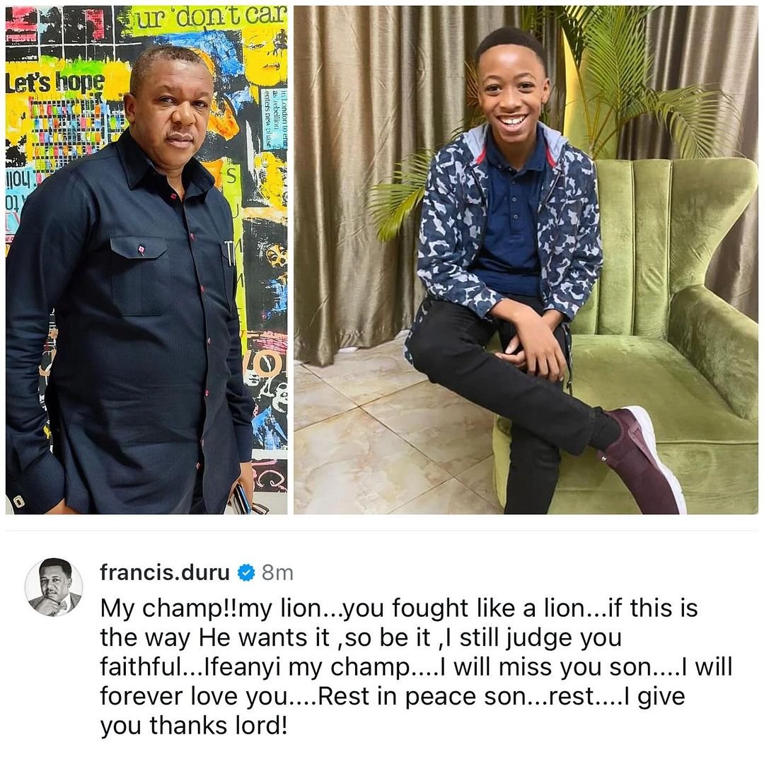 Nigerian actor, Francis Duru, has announced the death of his son, Ifeanyi.
