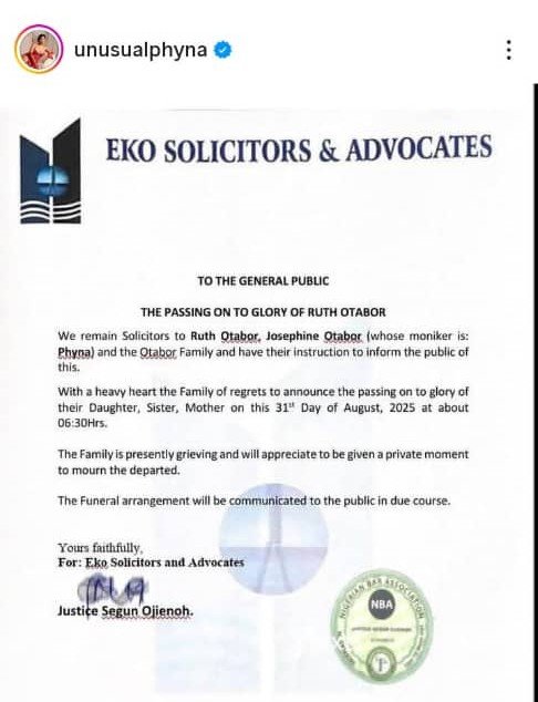 Eko Solicitors & Advocates, the law firm representing the late Ruth, Phyna and the Otabor family, announced the passing of Ruth in a statement via Phyna’s verified Instagram account on Sunday, August 31, 2025.