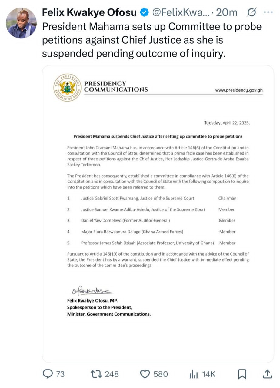 The suspension was announced on Tuesday, April 22, 2025, marking a significant moment in Ghana’s judicial history, as the Chief Justice now faces a formal inquiry into her conduct.