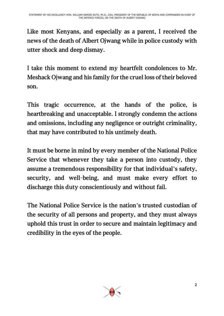 While extending his heartfelt condolences to Ojwang’s father, Meshack Opiyo Ojwang and his family, President Ruto said “It must be borne in mind by every member of the National Police Service that whenever they take a person into custody, they assume a tremendous responsibility for that individual’s safety, security, and well-being, and must make every effort to discharge this duty conscientiously and without fail.”