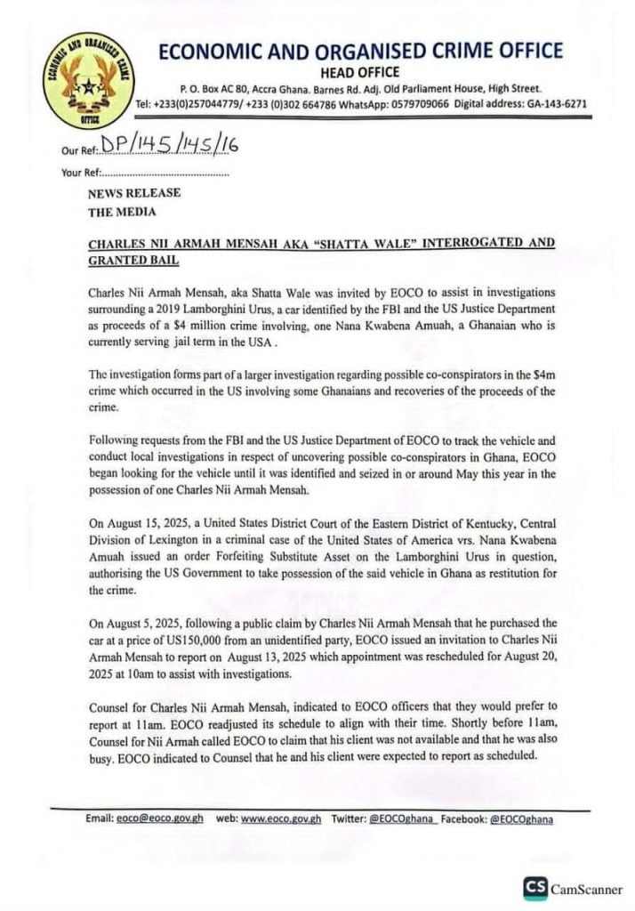 The Crime Office said these in a statement issued on Thursday, August 21, 2025, a day after Shatta Wale, real name Charles Nii Armah Mensah, was detained by EOCO over the car which FBI and the US Department of State have linked to fraud in the US.