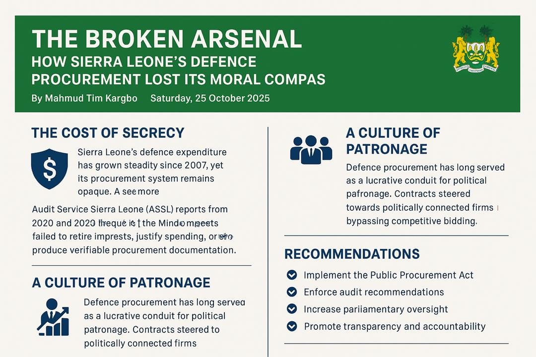 When President Dwight D. Eisenhower delivered his farewell address in 1961, he warned against the rise of a “military-industrial complex”, a structure in which state defence and private profit dangerously intertwine to undermine democracy. Sierra Leone, though small in geography and resources, now faces a similar moral crisis. Over two decades after its civil war, the nation’s defence procurement system has evolved into a labyrinth of secrecy, inefficiency and political patronage that threatens to erode the democratic gains painfully achieved after conflict.