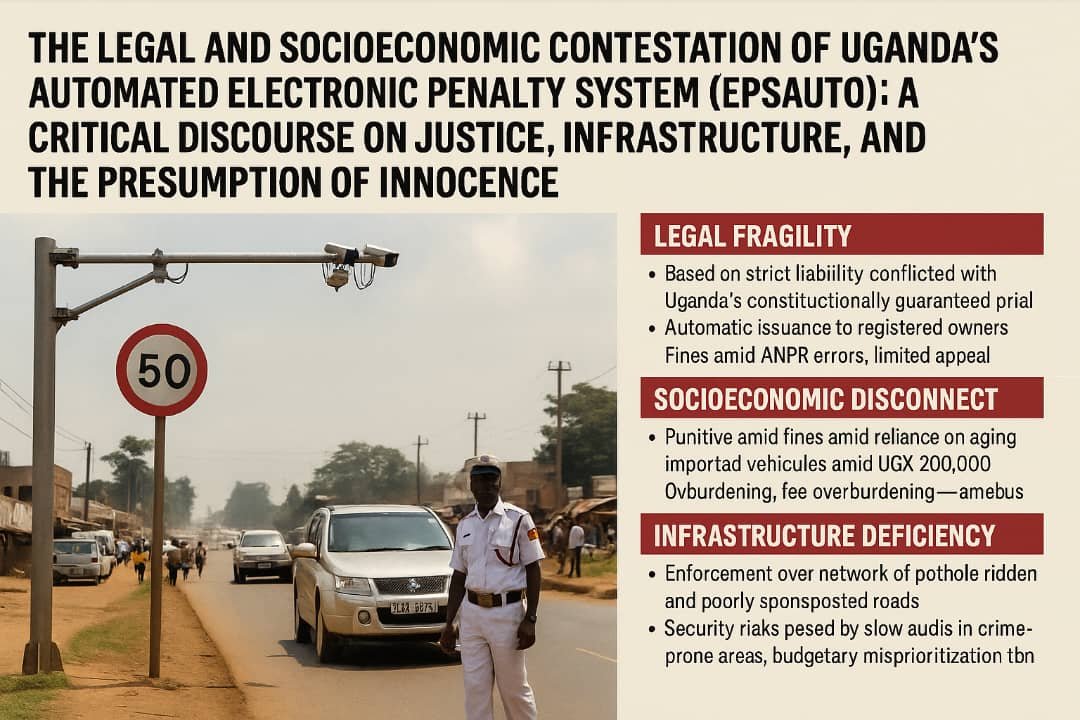 The introduction of Uganda’s Automated Electronic Penalty System (EPSAuto) under the Intelligent Transport Monitoring System (ITMS) in April 2025 has ignited a wave of public outrage, legal scrutiny, and constitutional contestation. Enacted through a Ministerial directive from the Uganda Police Force in collaboration with a private contractor (allegedly of Russian origin), the system automates the process of traffic law enforcement using Automatic Number Plate Recognition (ANPR) and red-light cameras. Infractions such as overspeeding and signal violations are captured, verified, and electronically ticketed to the registered vehicle owner’s phone number or email, who must pay a fine—UGX 200,000 for 1–30 km/h overspeed and UGX 600,000 for higher speeds—within a 28-day (or in some instances 72-hour) window or face a 50% surcharge and administrative sanctions, including impoundment, denial of license renewal, and suspension of travel privileges.