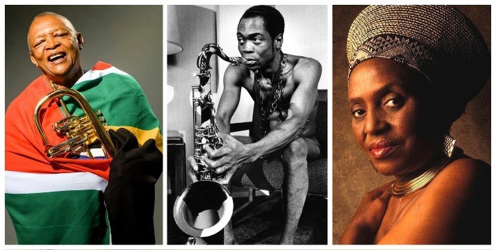 From left to right: Hugh Masekela, Fela Kuti and Miriam Makeba