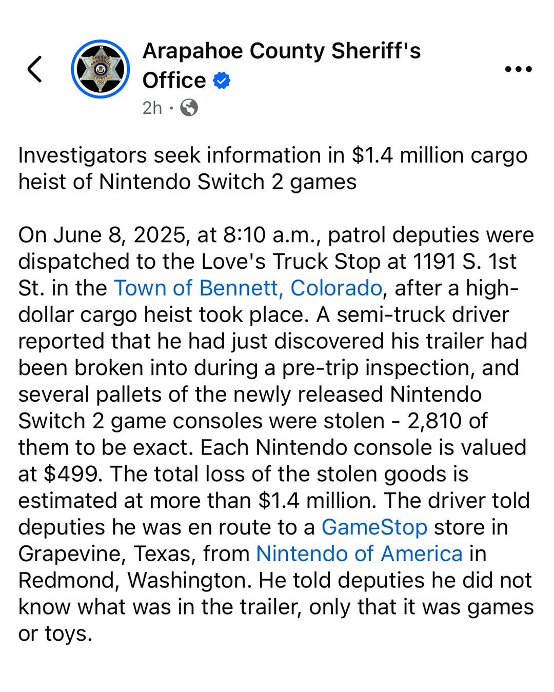 It says “The total loss of the stolen goods is estimated at more than $1.4 million,” adding that “The driver told the deputies he was en route to a GameStop store in Grapevine, Texas, from Nintendo of America in Redmond, Washington. He told deputies he did not know what was in the trailer, only that it was games or toys.”
