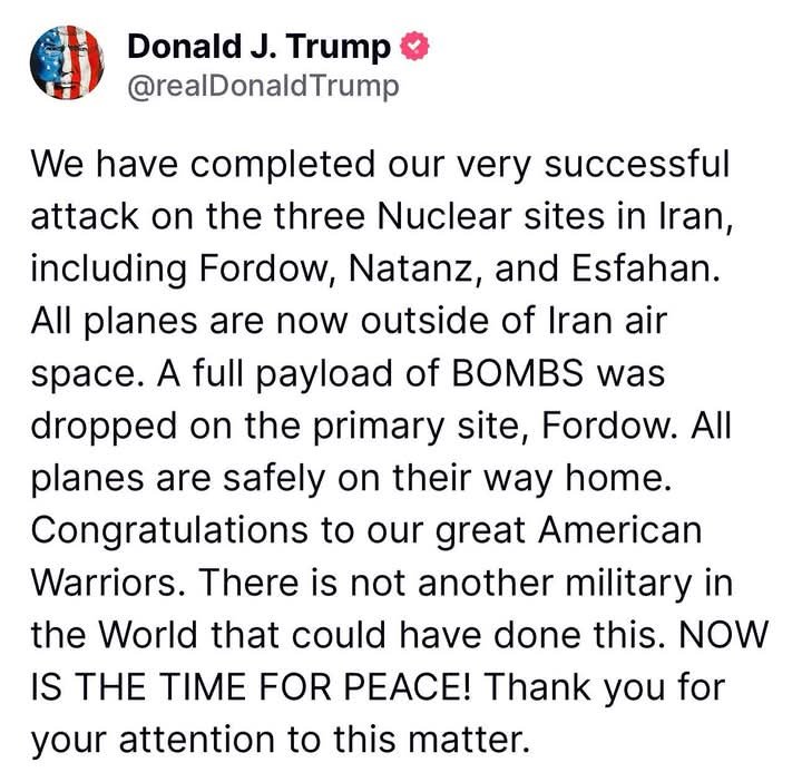 According to Trump, “We have completed our very successful attack on the three Nuclear sites in Iran, including Fordow, Natanz, and Esfahan. All planes are now outside of Iran air space. A full payload of BOMBS was dropped on the primary site, Fordow. All planes are safely on their way home. Congratulations to our great American Warriors. There is not another military in the World that could have done this. NOW IS THE TIME FOR PEACE!”