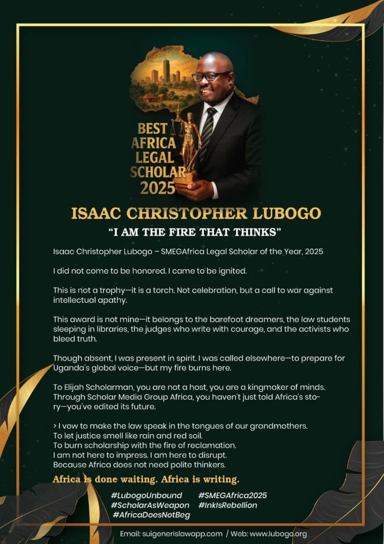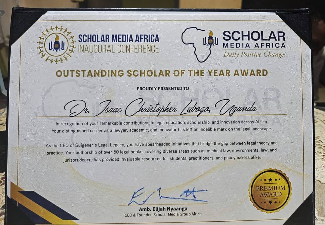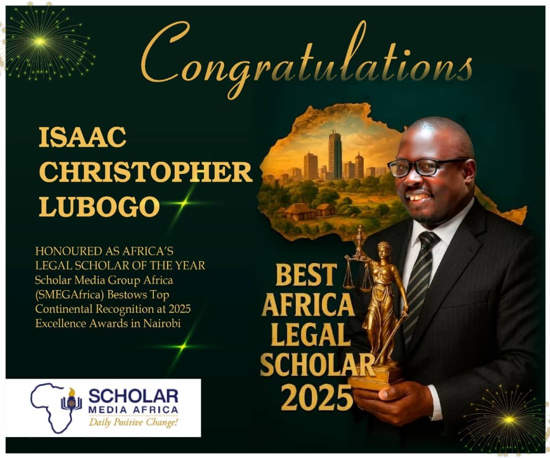 In a landmark moment for African legal scholarship, Isaac Christopher Lubogo, renowned Ugandan legal academic, author, and CEO of Suigeneris Legal Legacy, has been awarded the Outstanding Legal Scholar of the Year by Scholar Media Group Africa (SMEGAfrica) at the Inaugural SMEGAfrica Excellence Awards held at the Nairobi Serena Hotel.