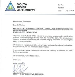 “The Volta River Authority (VRA) intends to commence engagements regarding the potential controlled spillage of water from the Akosombo Dam. This precautionary measure is crucial to maintaining the structural integrity of the dam and ensuring the safety of our communities,” the notice read.